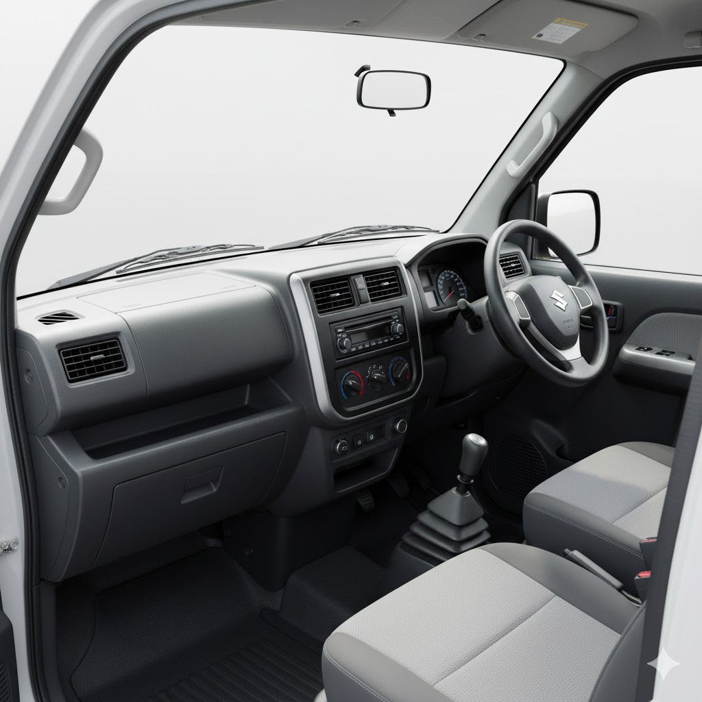 Dashboard sederhana namun fungsional, memudahkan akses pengemudi terhadap kontrol penting. Terdapat banyak ruang penyimpanan kecil seperti cup holder dan dashboard pocket untuk menyimpan barang-barang kebutuhan kerja.